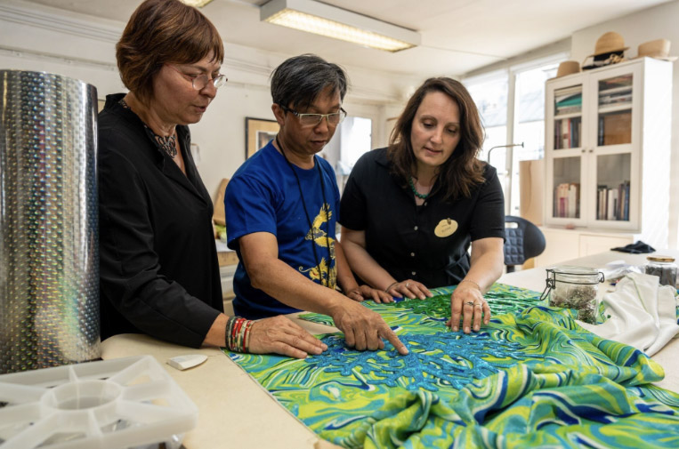 Dans les locaux, une dizaine de salariés sont penchés sur des tissus. On y retrouve aussi Isabelle, la costumière dessinée de Disneyland Paris, aux côtés d’Éloïse et Margaux, respectivement « costumière production et assistante de production pour Bas et Hauts. Leurs robes noires contrastent avec les couleurs chatoyantes des créations. Souvent, les regards sont tournés sur un écran : il faut dire qu’Isabelle et Laura travaillent ensemble depuis plus de vingt ans.**