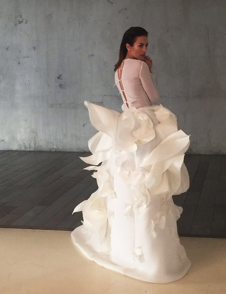 Haut de robe en voile, jupe en double et triple organza avec fleurs rapportées et incrustées soutenues par un grand panier court. 2017