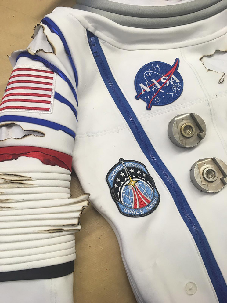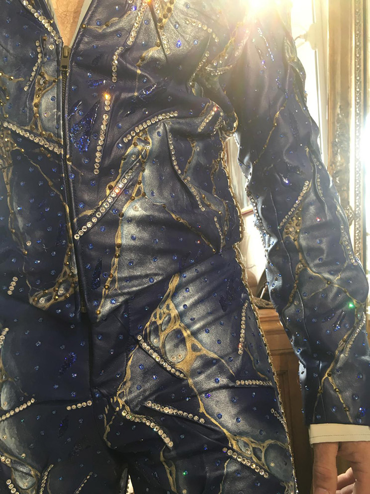 Costume moitié motard en faux cuir stretch moitié smoking en crèpe satin ivoire stretch, 2016